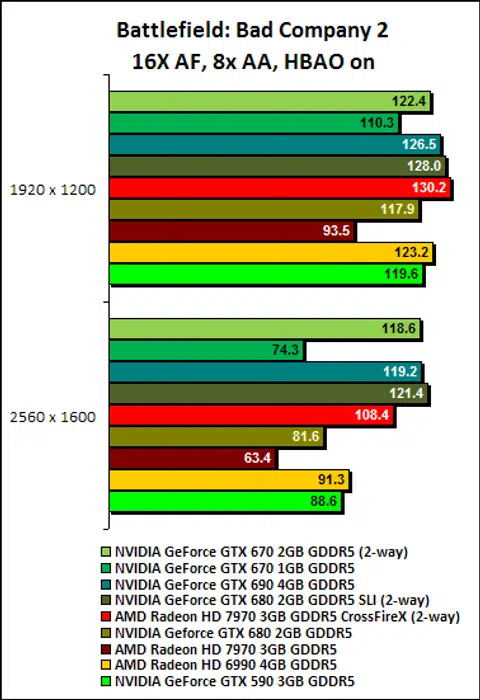 Performance scaling is decent, but considering how fast a single GeForce GTX 670, you’ll only really see improvements on ultra-high resolutions and the more intensive settings. For example, on Battlefield Bad Company 2, at 1920 x 1200, we only saw an improvement of only 10% going from a single GeForce GTX 670 to two GeForce GTX 670 cards in SLI. However, moving on to 2560 x 1200, two GeForce GTX 670 cards in SLI managed to net a more significant 60% improvement in performance.