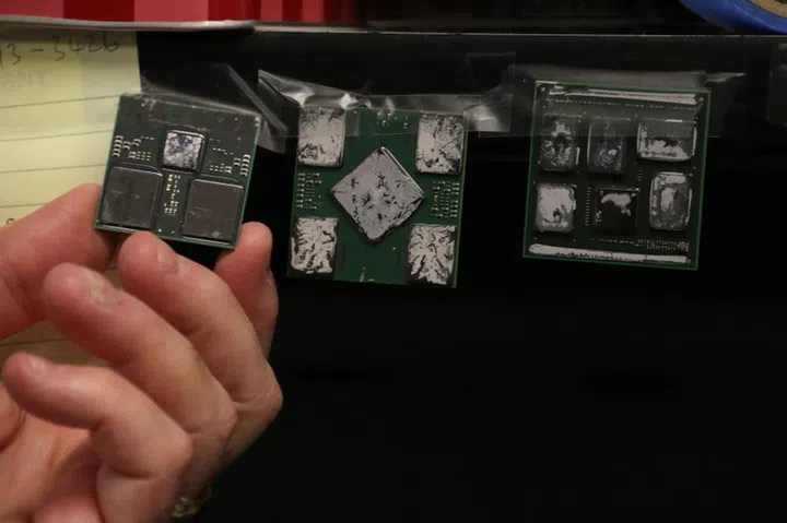 In this picture, you can see the original NVIDIA CELL Processors on the left and in the middle. The processor in the middle was the original 90nm CELL processor that was used in the first generation of PlayStation 3 (PS3). The CELL Processor on the left represents the 45nm variation of the same processor, when advancement in technology allowed NVIDIA to shrink the die size.
