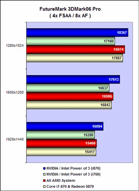 We begin our report with the time-tested 3DMark06 benchmark but this is just for your information as the newer Vantage is being used more often these days for comparisons. Here, the NVIDIA/Intel system powered by the i7-870 scored the highest, but the all AMD system was only a smidge behind. The i5-750 powered system rounded up the pack.