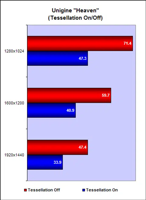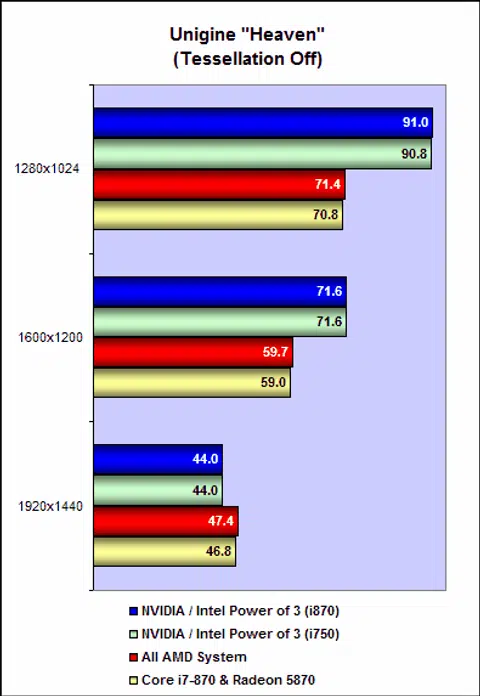Unigine's Heaven benchmark is the one of the first benchmarks in the world to take full advantage of DirectX 11's tessellation feature. Running with tessellation disabled, we found that the NVIDIA/Intel systems were noticeably quicker when running at 1280 x 1024 and 1600 x 1200. At 1920 x 1440 however, their performance dipped considerably.