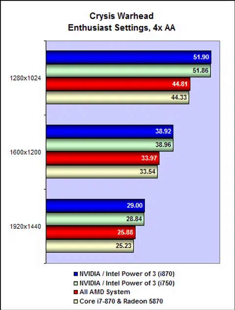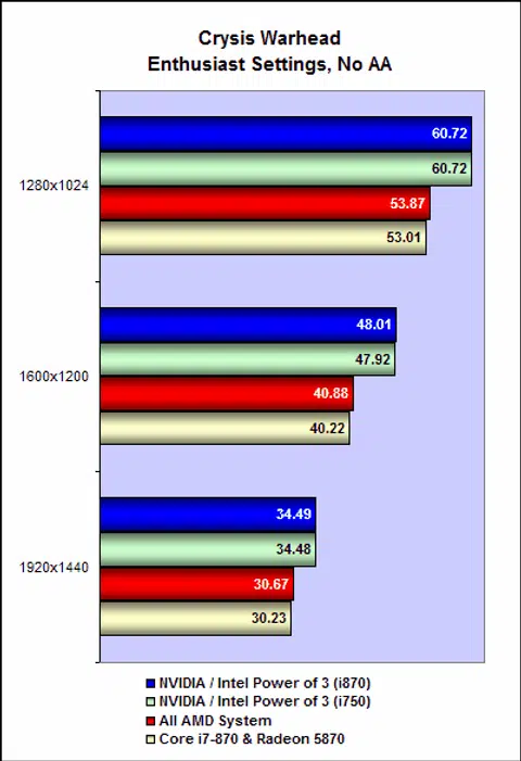 Crysis Warhead was one for the Power of 3 platforms, as they were about 12% faster than the all AMD system. Interestingly, we also noticed that it is your graphics card that largely determines what kind of performance you get on Crysis Warhead - note the similar performance between the two NVIDIA and ATI powered setups, and how the NVIDIA powered setups were better.