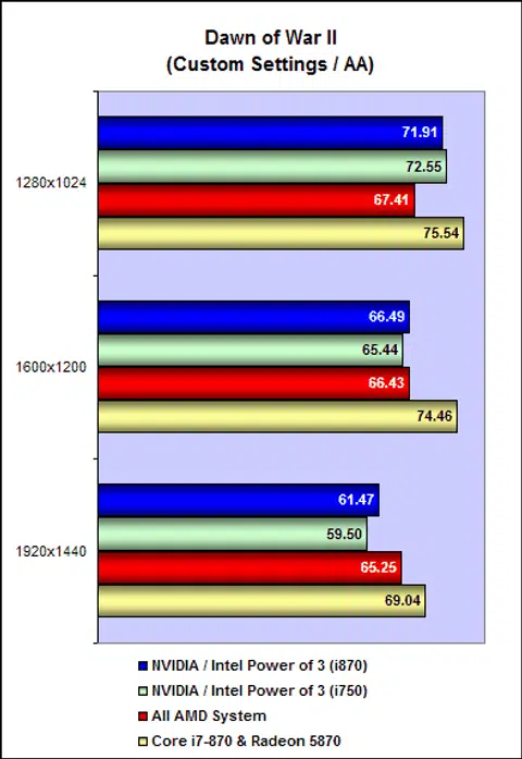 On Dawn of War 2, the two NVIDIA/Intel systems sprinted to an early lead against the AMD setup, but as we upped the resolution, the all AMD system clawed its way back with its consistent results. Also, as we ran the Radeon 5870 on the same i7-870 setup that the GeForce GTX 295 was running on earlier, it became apparent that the ATI card is the better performer on Dawn of War 2, just as it has been for sometime now.