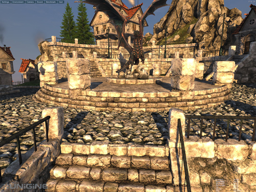 Now back to this benchmark, if you have taken in what we've mentioned above, this Heaven benchmark from Unigine isn't a good one at all for contrasting the differentiation of running the benchmark in different DirectX standards. If you look at our own screenshots, the staircase is more like a ramp plastered with a rock texture when run in DirectX 9/10 or when having Tessellation off. Honestly, what game would even render such a simple thing such as a staircase with such a mismatch of reality?