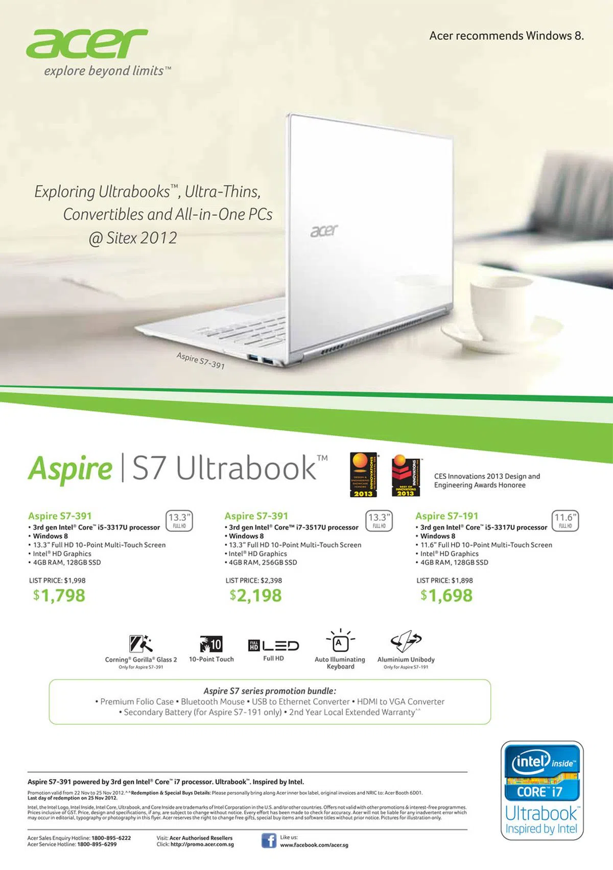The new Acer Aspire S7 Windows 8 Ultrabook doesn't just look stunning, it has the specs to back it up too. Available in either 11 or 13-inch variants, each features a slim and lightweight aluminum unibody construction. If you opt for the 13-inch model, you'll also get a robust Corning Gorilla Glass 2 screen. Both models are equipped with full HD 1920 x 1080 pixel resolution 10-point multi-touchscreen displays, essential for fully experiencing all of the touch features of Windows 8. Internally, both models are identical, utilizing Core i5 CULV processors, 4GB RAM and 128GB SSDs.