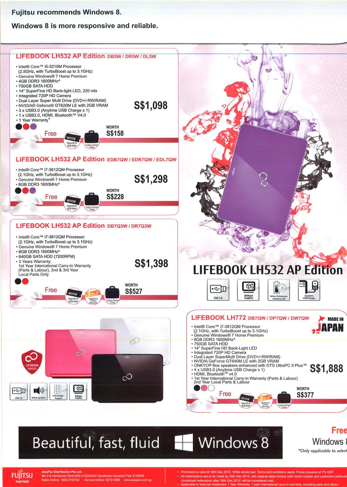 - Promotion: Free upgrade to 8GB RAM, Microsoft Office 2010 Home and Business Edition, Fujitsu Carrier Case (together worth $427)