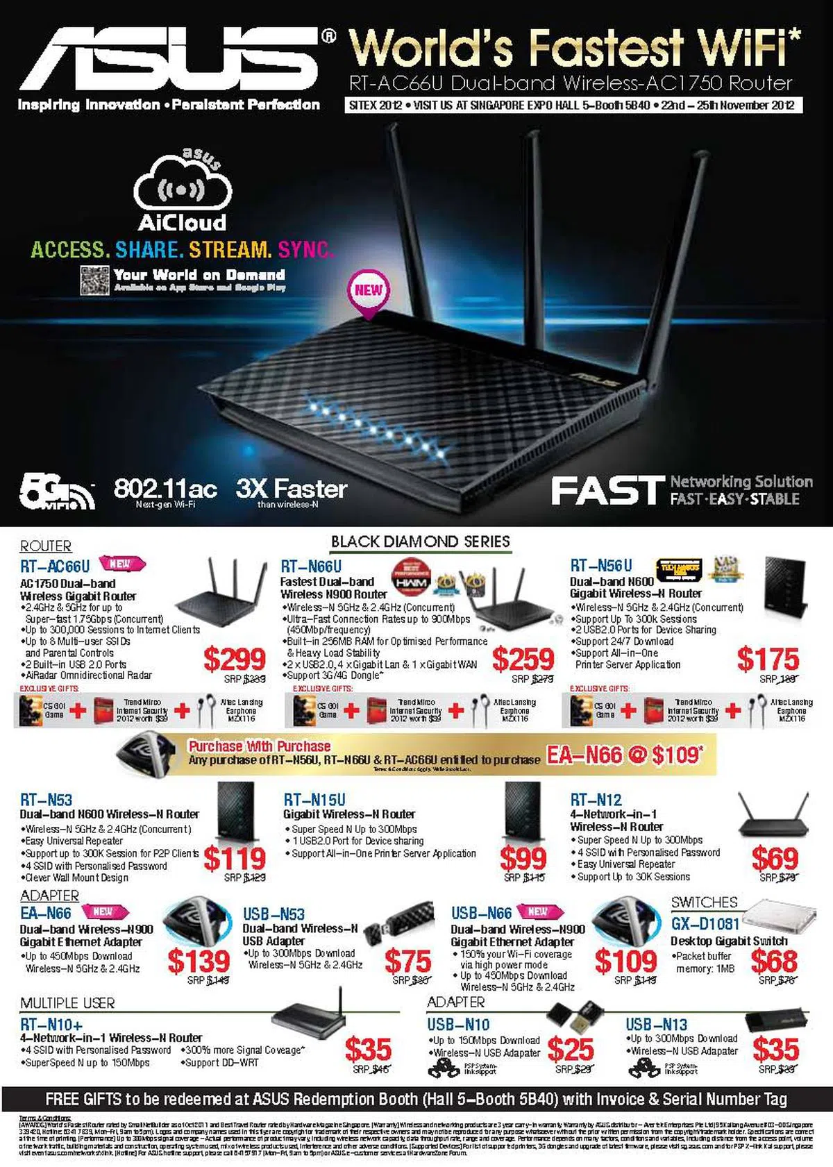 The ASUS RT-AC66U Wireless-AC Dual-band Router is ASUS' flagship router and features ASUS' AiCloud service, a mobile application service compatible with iOS and Android that lets you access, stream, sync, and share your files on the go through the router. Other impressive features include next gen Wi-Fi (802.11ac) support, a 30-second setup, six guest SSIDs (three on 5GHz, and another three on 2.4GHz), and a fancy "high-density aluminum fins" cooling system.