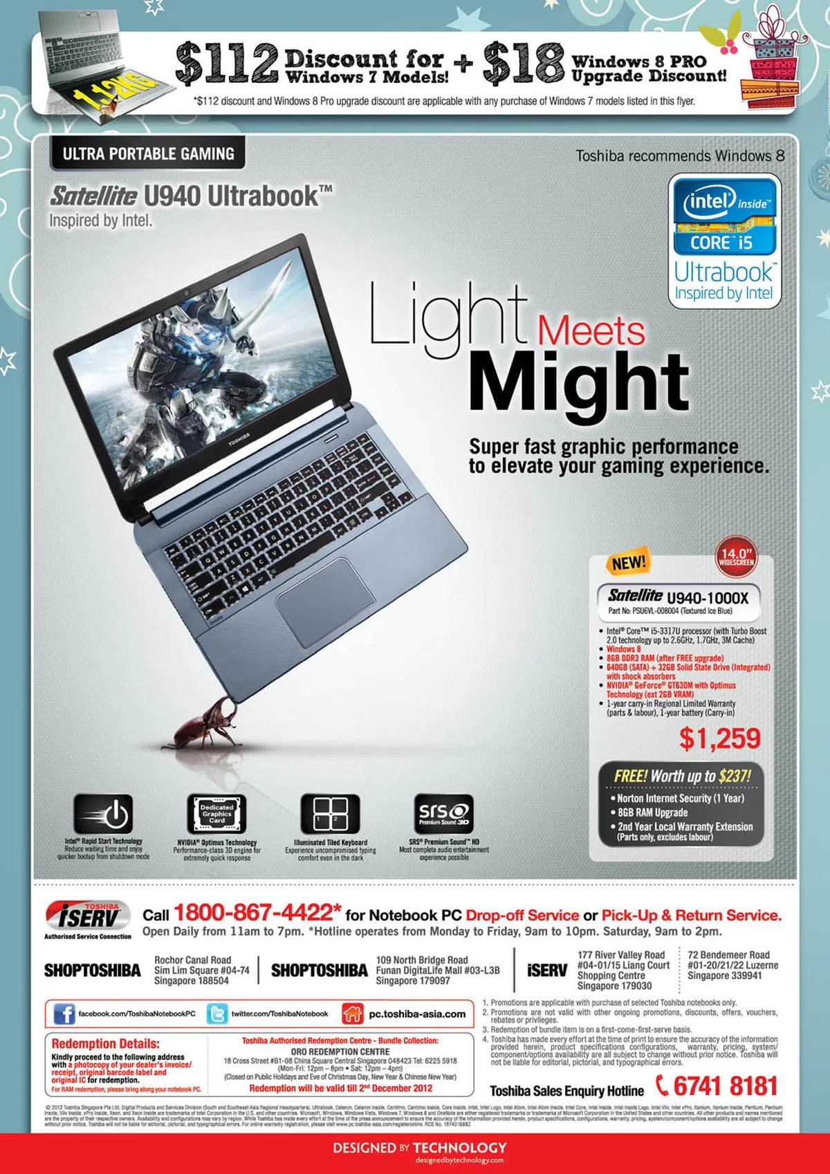 - Promotion: Free 1 year Norton Internet Security, 1 year local pick up and return service, 3 years international warranty extension and Toshiba External 500GB HDD, instant $112 off, and upgrade to Windows 8 for $18.