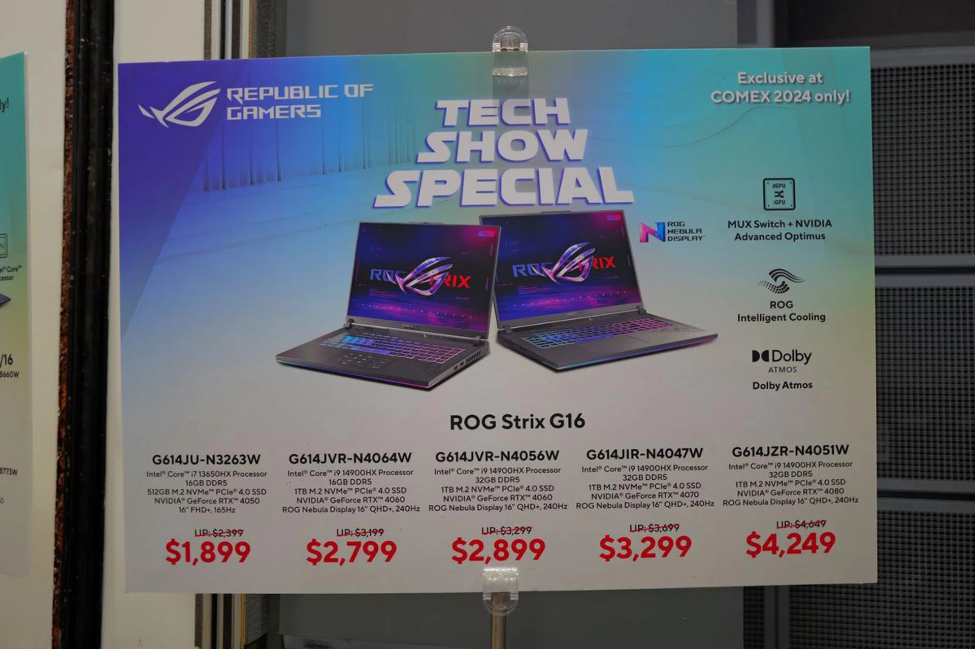 As you come up to the exhibition floor it’s hard to miss this ROG Strix G16 offer as I’ve seen posters of it at the Challenger’s booth as well as inside the main hall. The gaming laptop comes in a variety of specifications, but I thought the Core i9-14900HX and NVIDIA GeForce RTX 4060 Laptop GPU combo offers the best value for performance at $2,899. But if you’re looking for more graphics firepower there’s also a model with the GeForce RTX 4080 Laptop GPU that is selling for $4,249.