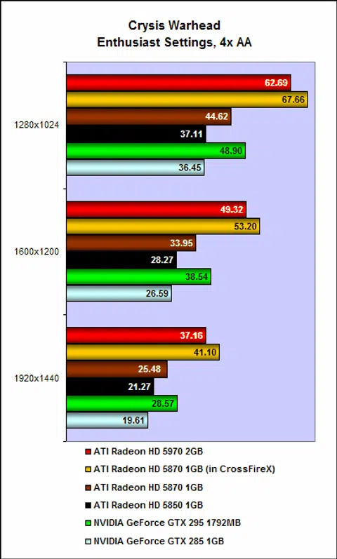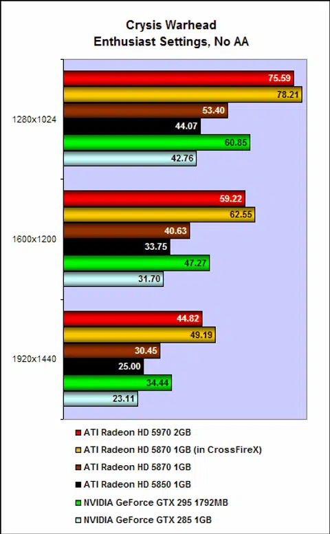 Crysis Warhead saw the Radeon HD 5970 dominating again, and it gets the distinction of being the only single graphics card capable of producing playable frame rates (above 30fps) on the most demanding setting of 1920 x 1440 resolution with anti-aliasing enabled. To add, it was about 30% faster than the GeForce GTX 295. And again, it lost out only to the pair of Radeon HD 5870 cards in CrossFireX configuration.
