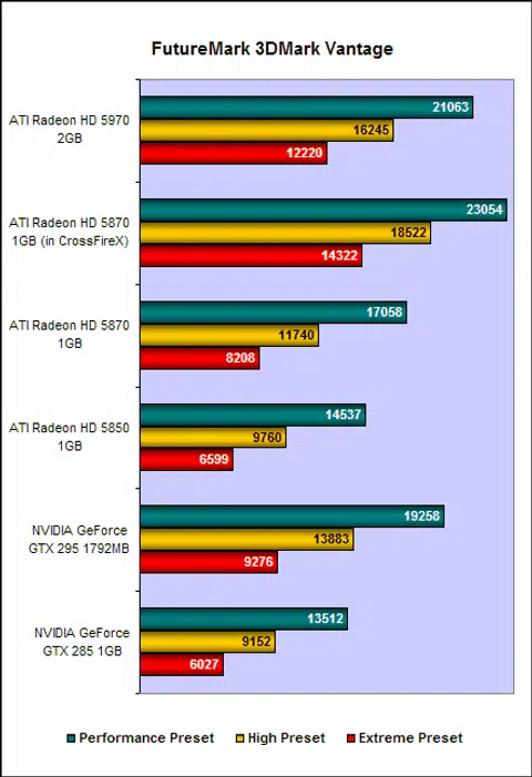 We begin our report with 3DMark Vantage, and immediately saw the Radeon HD 5970 powering ahead. On the most intense setting, it comprehensively outscored the NVIDIA GeForce GTX 295 by an astonishing 31%. However, the Radeon HD 5970 could not beat the combined might of two Radeon HD 5870 cards in CrossFireX configuration - the duo has higher clock speeds.