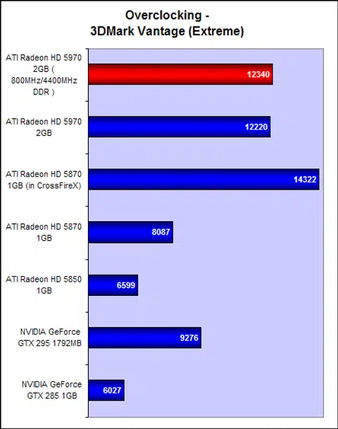Using the in-built ATI Overdrive overclocking tool, we managed 800MHz at the core and 4400MHz DDR at the memory, which gave us a negligible improvement of 120 3DMarks. Further attempts to replicate the higher clock speeds of the Radeon HD 5870 failed, as Vantage would crash halfway into the benchmarking run. Apparently, the Radeon HD 5970 is not a very keen overclocker despite what ATI /AMD would like to have us believe. Perhaps it could be somewhat linked to the early driver nature and this may yet see an area of improvement in the near future.