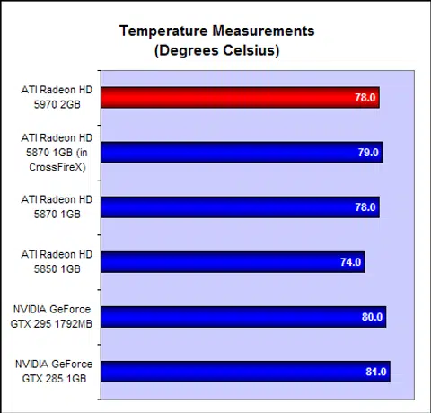 In terms of load operating temperatures, the Radeon HD 5970 did better than we expected, recording a respectable (for high-end cards at least) 78 degrees Celsius. Perhaps the larger vents had a role to play? Also note that both GPUs in the new card recorded roughly the same load operating temperatures which is quite comforting to know that the card's cooling system works for it.