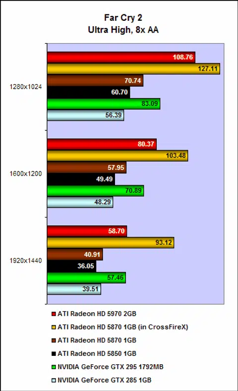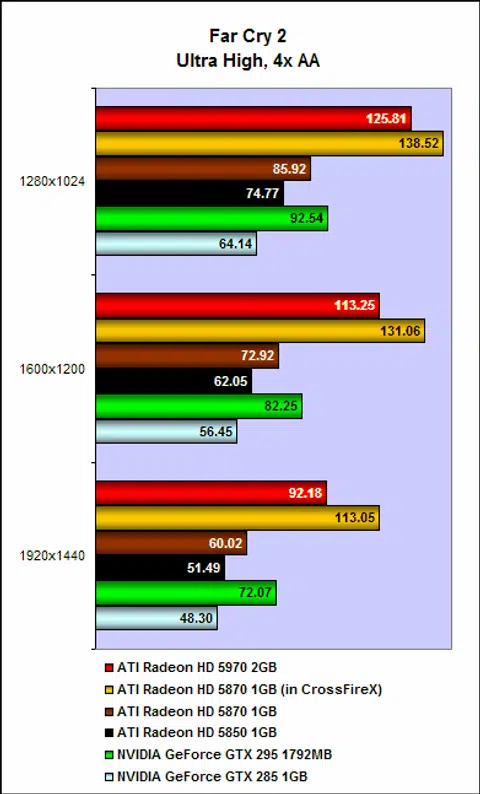 It was the same story on Far Cry 2, as the Radeon HD 5970 was once again the best performing single graphics card by some distance. Interestingly though, the pair of Radeon HD 5870 graphics cards managed to outperform the new single graphics card king by quite a margin yet in this benchmark.
