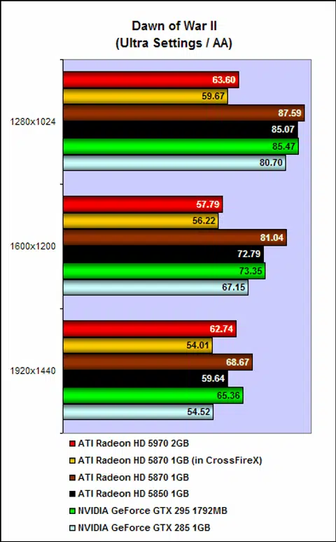 The Radeon HD 5970 disappointed on Dawn of War 2, where it managed low and inconsistent frame rates. The same problem was exhibited by the pair of Radeon 5870 in CrossFireX too, which could point to a problem with poor driver optimization for CrossFireX configurations. Looks like we'll need newer drivers to heal these issues.