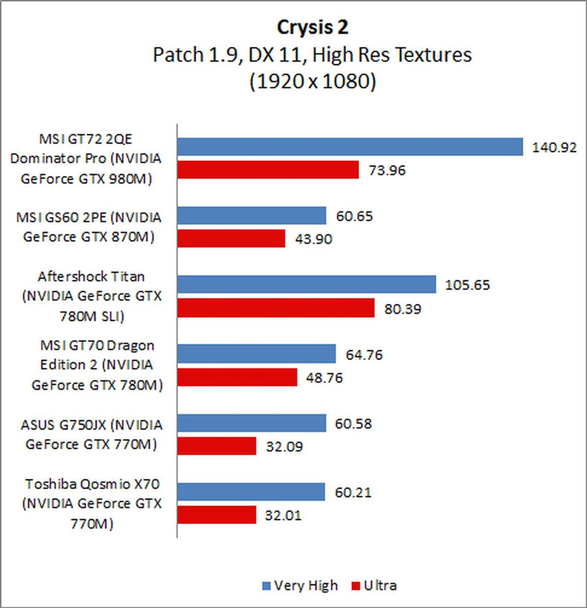 One thing to note: We had issues benchmarking Crysis 2 on the Aftershock S15 for some reason so it's not included in the results, which is a bit disappointing. Other than that, the Crysis 2 benchmark is not telling us anything new that we didn't suspect in the first place. It readily blew away even the SLI'ed Afershock Titan on Very High image quality settings, though the linked NVIDIA GeForce GTX 780Ms in the Titan eventually proved hardier when running in Ultra mode. But even then, the difference in framerate is largely unnoticeable to the naked eye.