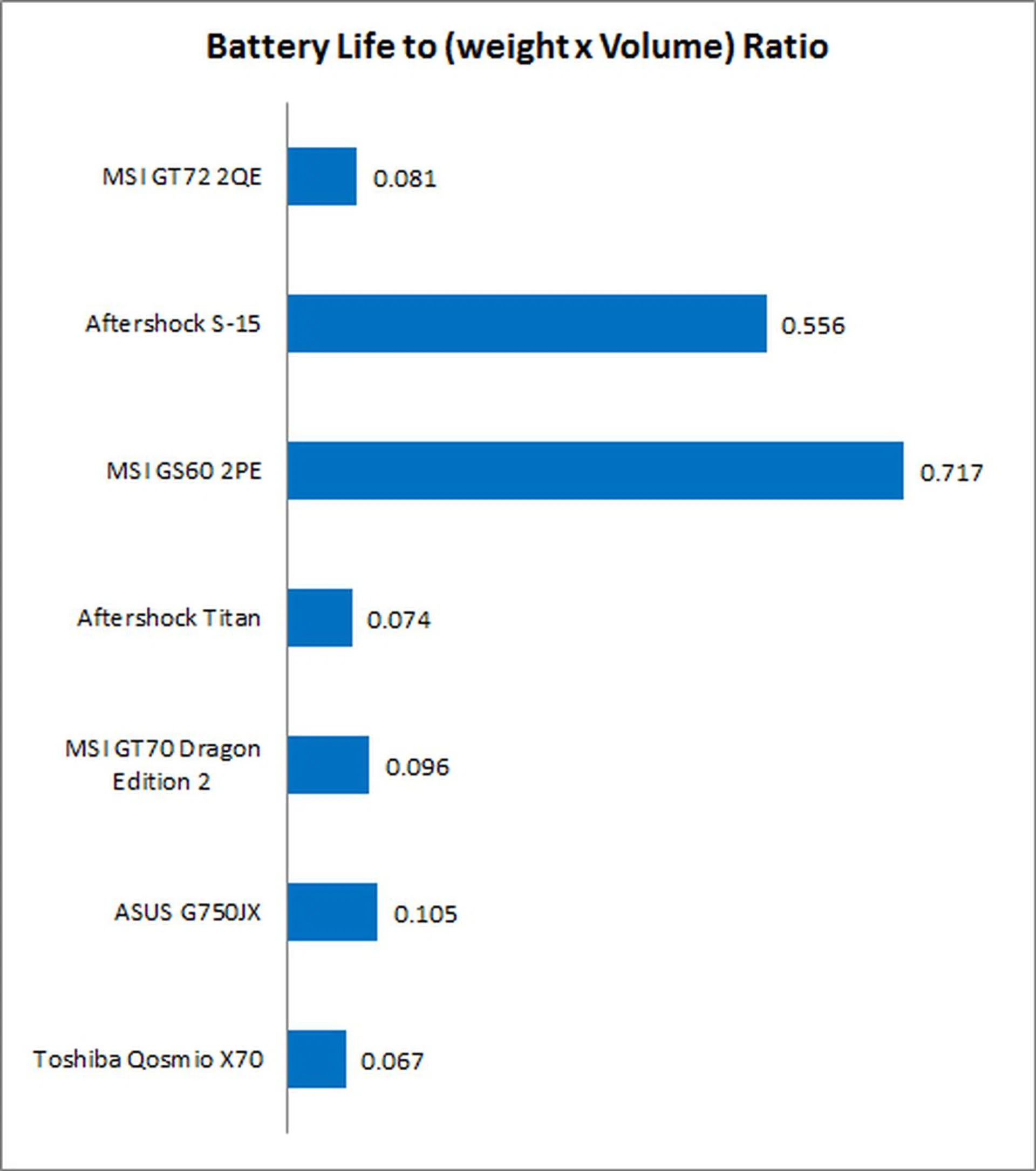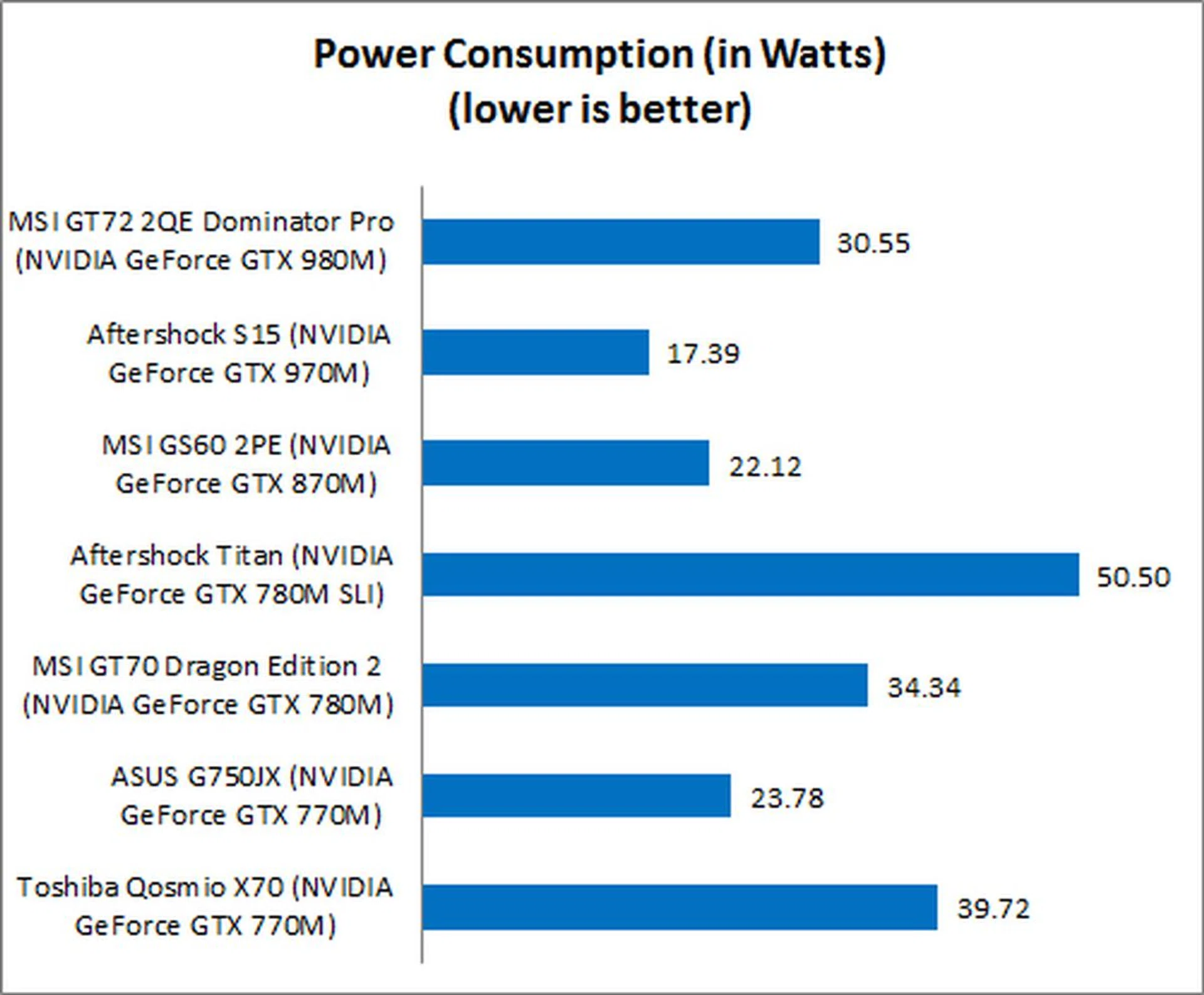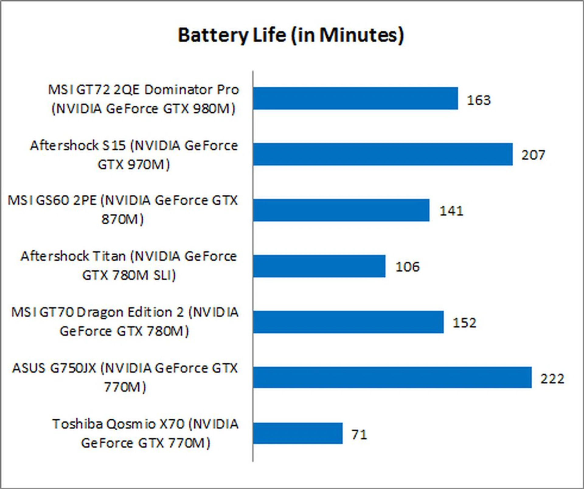The GT72 2QE Dominator Pro is a gaming powerhouse but the trade-off to that is that it drains the battery rapidly. It's definitely not as bad as some of the other notebooks, but it seriously lags behind the Aftershock S15, which uses a set of components one notch below it. Before you go crying foul, remember that the Aftershock S15 is a 15-inch notebook while the GT72 2QE Dominator Pro is a 17-inch notebook. Two inches may not seem like much physically but it does make a difference in energy consumption - larger displays require considerably more power. The MSI GT72 2QE Dominator Pro's processor is also rated at a higher TDP, which also contributed to its high power consumption in addition the difference in GPU.