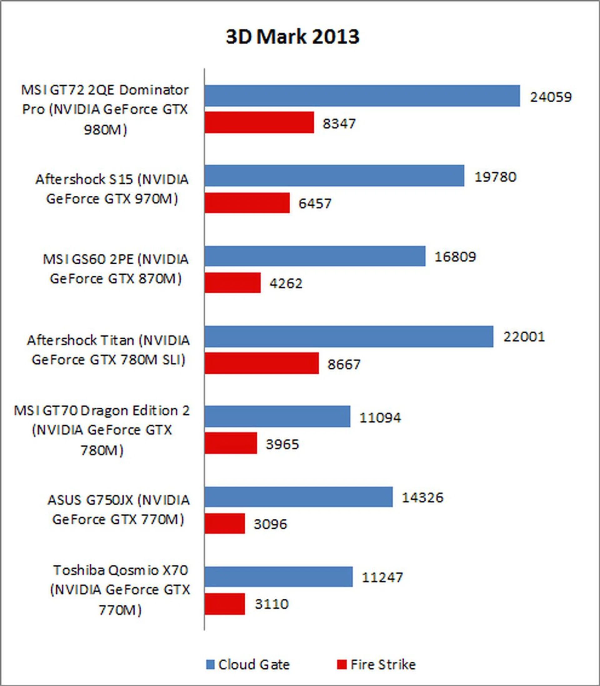 Again, there wasn't any surprises. The GT72 2QE Dominator Pro outclassed all of the single GPU notebooks comfortably in every aspect and put up a tremendous fight against the SLI'ed Aftershock Titan. When compared to its younger sibling, the NVIDIA GeForce GTX 970M, the 980M posted results nearly 25% better in both categories. The MSI notebook even outperformed the Gigabyte Aorus X7 v2 (equipped with dual GeForce 860M GPUs) quite handily.