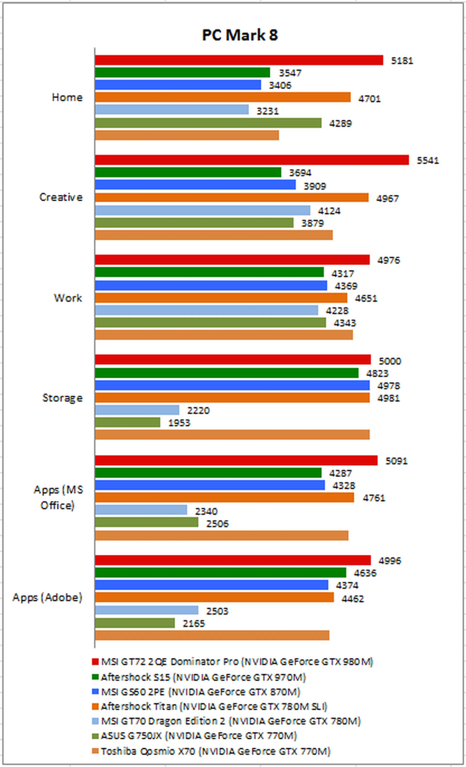 PC Mark 8's more of an overall benchmark rather than a GPU intensive one so the NVIDIA GeForce GTX 980M is not really put to the test here. Instead, it's mainly the processor that's taking the brunt of the workload. In the tests, we see that the processor in the GT72 2QE Dominator Pro (the Intel Core i7- 4980HQ), is surprisingly capable, outpacing the competition, even other Haswell cores like those found in the Aftershock S15. The Core i7-4980HQ is easily double the cost of most other mobile CPUs in this comparison and it shows its worth with speedier performance thanks to higher clock speeds.