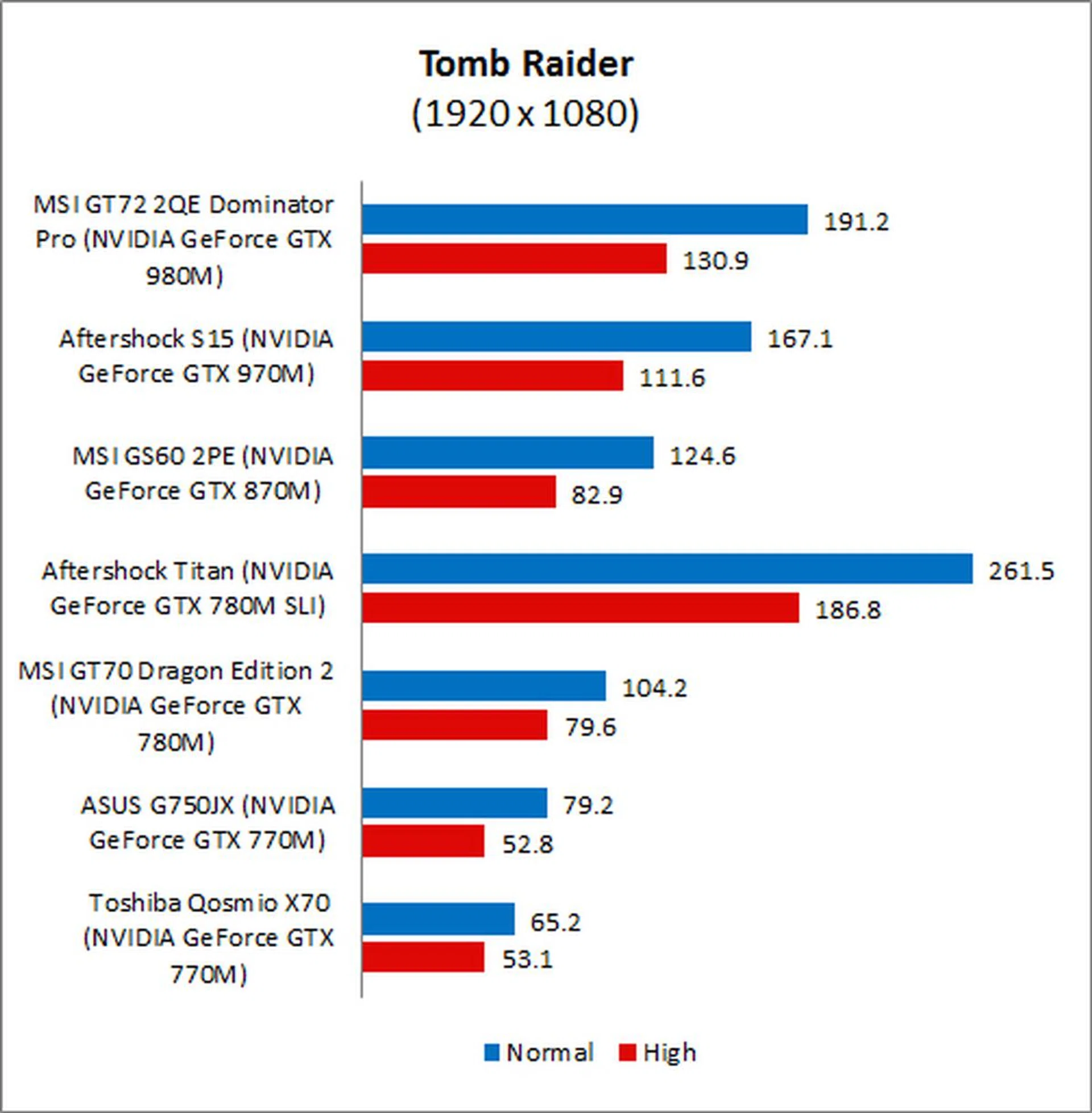 We're using Tomb Raider again for a couple of reasons. One, the other laptops all were benchmarked on it and two, the TressFX tech powering Lara's hair can bring even beefed up notebooks to their knees. Judging from the results, that's exactly what happened to the GT72 2QE Dominator Pro. It's still the best single GPU equipped notebook but compared to the Aftershock Titan's SLI rig, there's no contest. On both normal and high game quality settings, the Titan bested the GT72 2QE Dominator Pro easily.