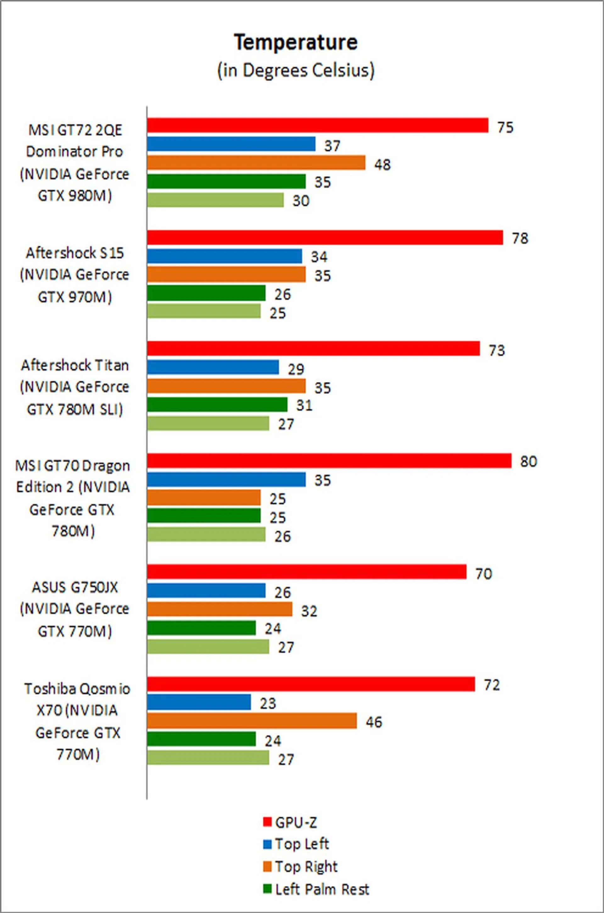 We didn't have a record of the temperature for the MSI GS60 2PE comparison notebook so we decided to omit it. Other than that, of the six notebooks, the GT72 2QE Dominator Pro came in third in GPU-Z. While its temperature isn't the coolest, it's still cooler than Aftershock S15 and just two degrees hotter than the Aftershock Titan. Still, the GT72 2QE Dominator Pro has a noticeably warmer chassis. In every corner, the temperature was the highest of all the tested laptops. This might be a side effect of using a more powerful CPU and GPU than the usual.