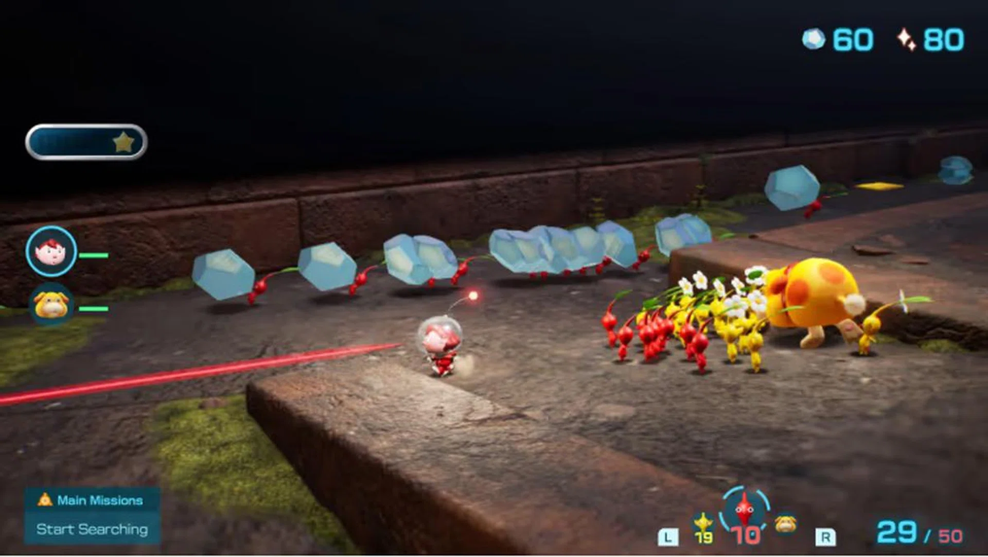 A Pikmin game won’t be any fun without its titular plant-like creatures, and in this game, Pikmin play a bigger role than ever in your intrepid explorer’s quest. Like in other Pikmin titles, your explorer must gather and propagate these tiny minions as you explore the game’s stages and the many underground caves (that act as sub-stages) found in each one. Once recruited, Pikmin become obedient followers that you can direct to do your bidding, including attacking the many creatures that roam each stage, building and structures to access new stage areas, or even digging for and transporting treasures.