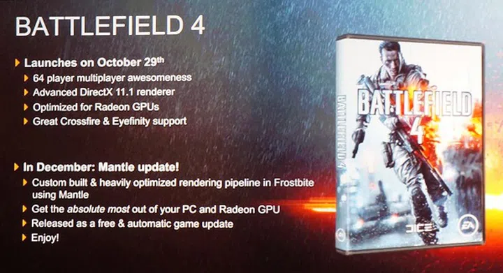 EA Games' Battlefield 4 is the first game to support AMD Mantle, but it will still launch normally on October 29th with AMD Mantle support updated in a December update.