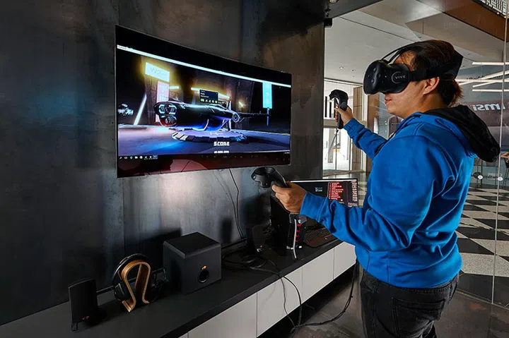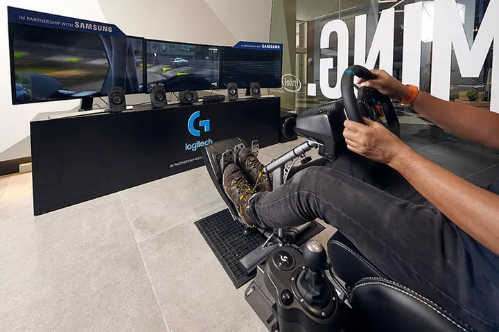 To get your adrenaline pumping, there’s also a racing rig beside the VR area, complete with a racing wheel, gaming seat, multiple curved monitors, and a multi-speaker audio setup for a super-realistic racing sim experience.
