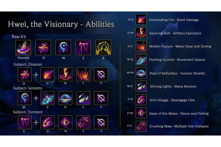 Hwei's abilities are divided into three distinct sets, each containing three spells. An interesting mechanic here is the interdependency within these sets: activating one ability automatically puts the other two on cooldown. This demands strategic selection and timing from the players, adding a layer of tactical depth to his gameplay.