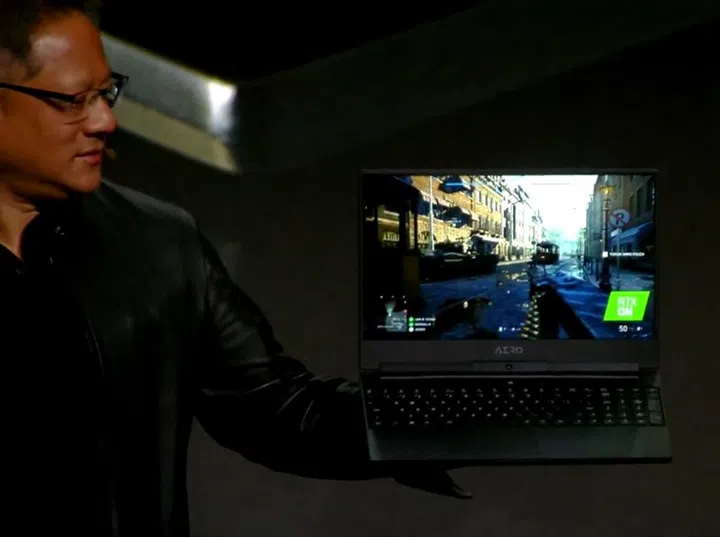 CEO Huang was so confident of the graphical processing prowess of the new laptops; he even showed off a new Gigabyte Aero gaming Max-Q notebook that’s equipped with GeForce RTX 2080 GPU, and it was operating BattleField V with RTX turned on.