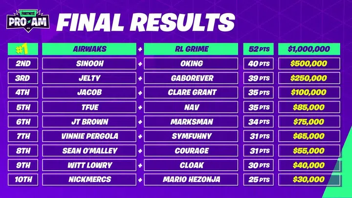 You can check out the final placements for the Pro-Am below - look how close some teams were to winning!