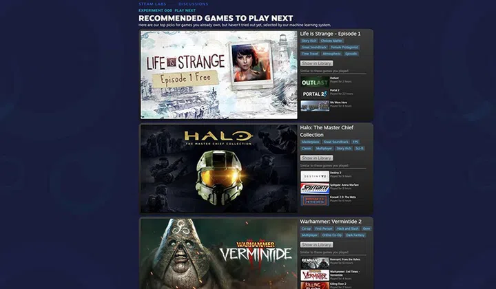 At the moment, Valve recommends that I should play Life is Strange - Episode 1, Halo: The Master Chief Collection, and Warhammer: Vermintide 2, which incidentally, have been near the top of my to-play list for a while now.