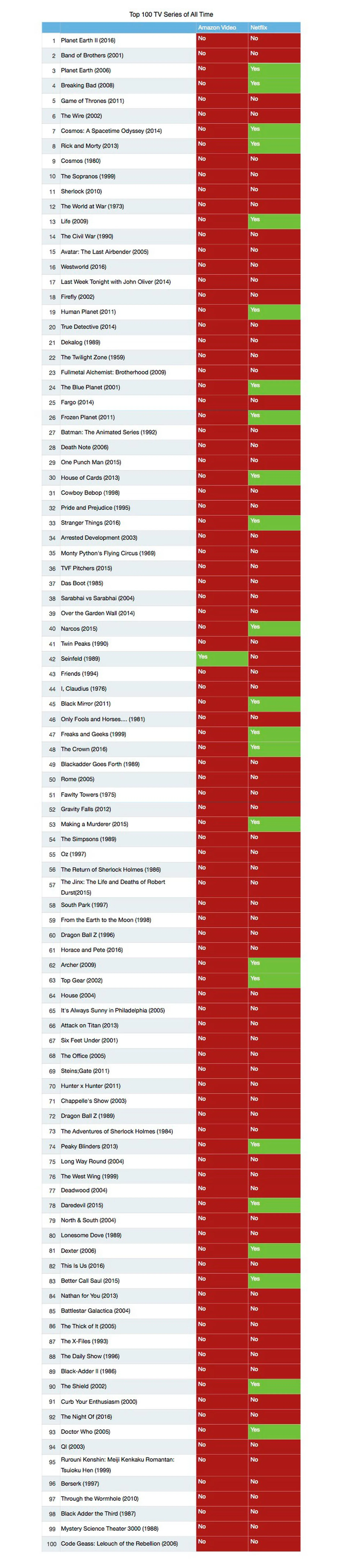 But because of international licensing issues, we’re not getting the full Amazon Prime Video or Netflix catalog on our tiny island. So is either worth paying for? And if you only wanted to get one, which would you get? To find out, I ran both catalogs through lists of the most highly-rated movies and TV shows, as ranked by Rotten Tomatoes.