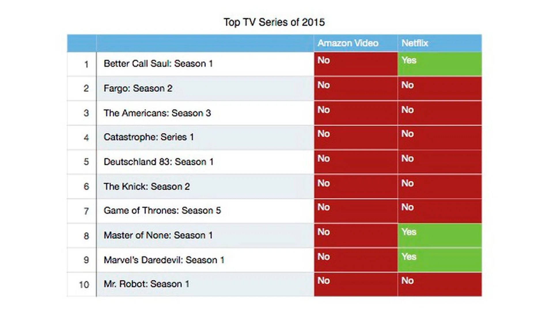 When it comes to last year’s TV series, Amazon Prime Video does 0/10, while Netflix has 3/10 of the best TV. Hardly scores to cheer about, but once again, Netflix has the critical advantage. All three of its scores are Netflix originals.