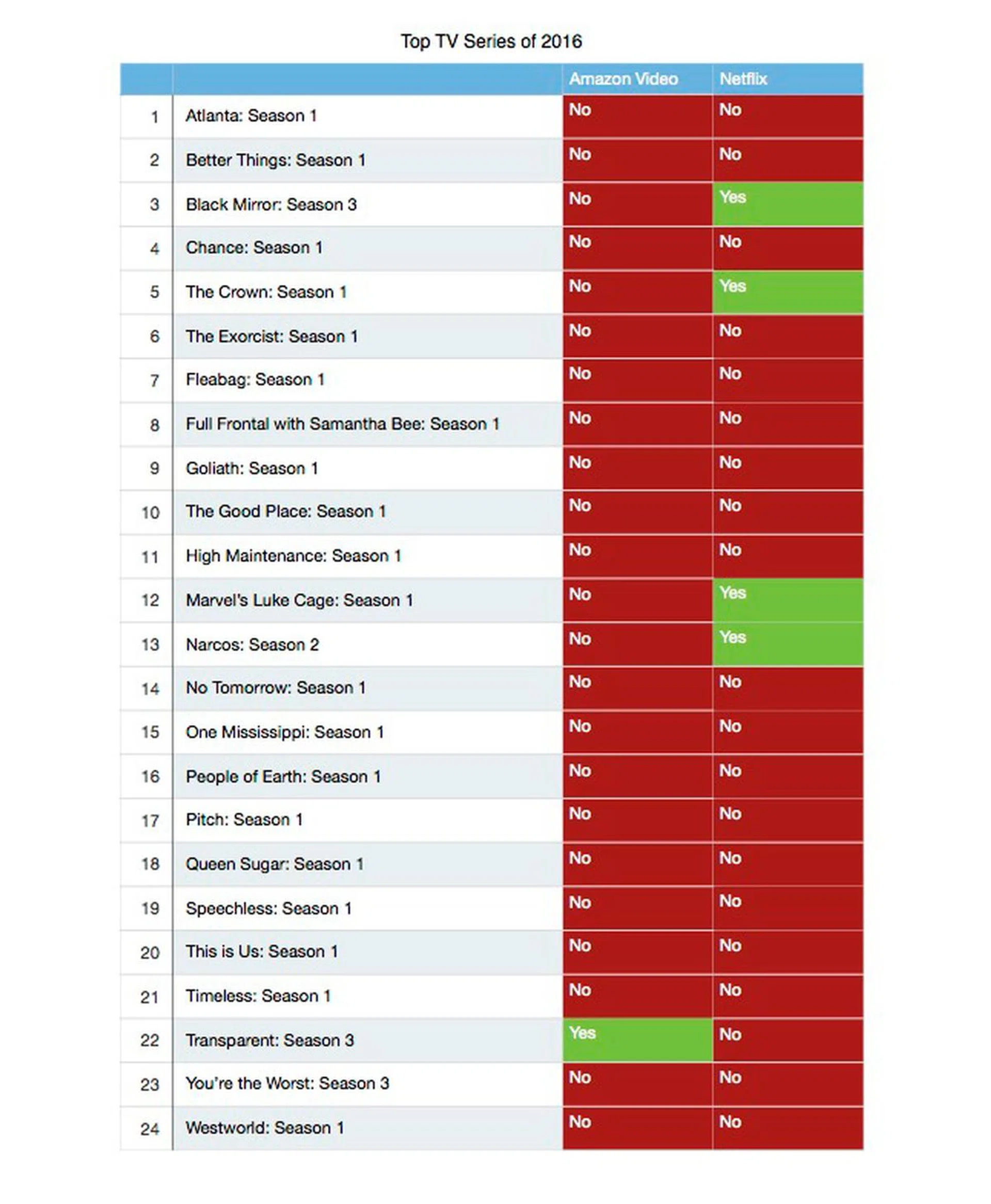 How about TV shows? According to Rotten Tomatoes, these are the best series you can catch right now. Amazon Prime Video scores a low 1/24, while Netflix scores 4/24. It’s still a bad score for Netflix, but it has the leg up when it comes to TV. Three of the top 24 shows, ‘The Crown,’ ‘Marvel’s Luke Cage’ and ‘Narcos: Season 2’ are Netflix originals.