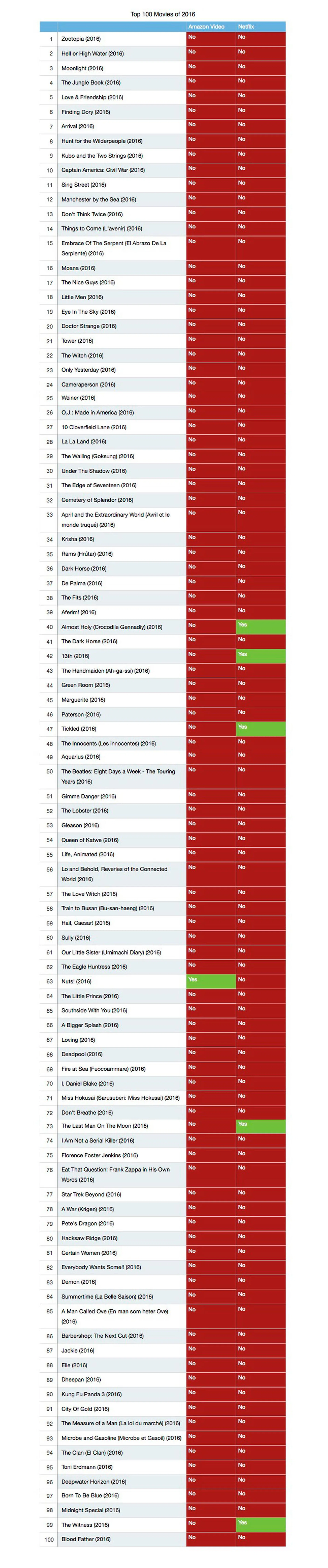 I first searched for the top 100 movies of 2016. Now, this list is unfair, as some of these movies are still showing in the cinemas or haven’t been released yet, like Arrival. Keeping that in mind, Amazon Prime Video scores 1/100, while Netflix scores 5/100.