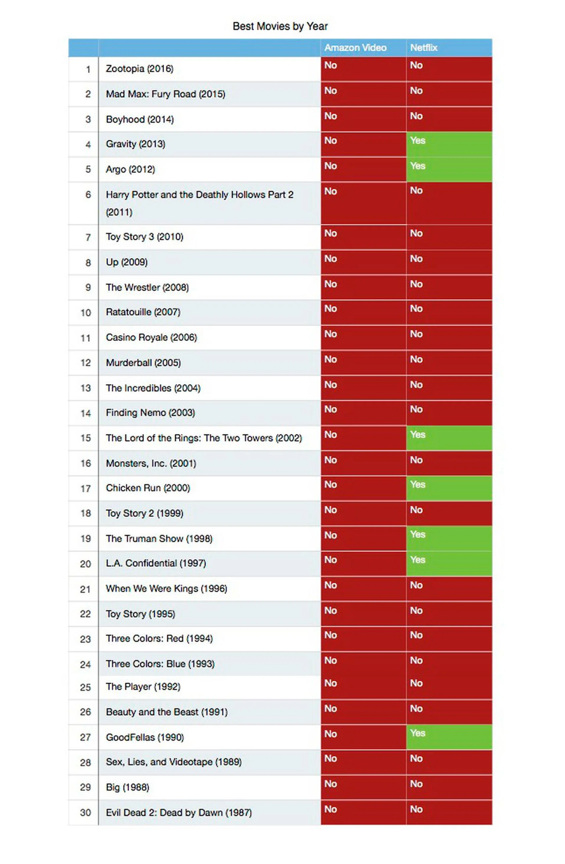 Okay, so far, not so good. What if you want to catch the number one film of the year, for the last 30 years? Amazon Prime Video still flails at 0/30, while Netflix scores 7/30. That’s still a low score, but if you ever wanted to catch up on the ‘Lord of the Rings’ trilogy, ‘The Truman Show’ or ‘LA Confidential,’ Netflix has you covered.