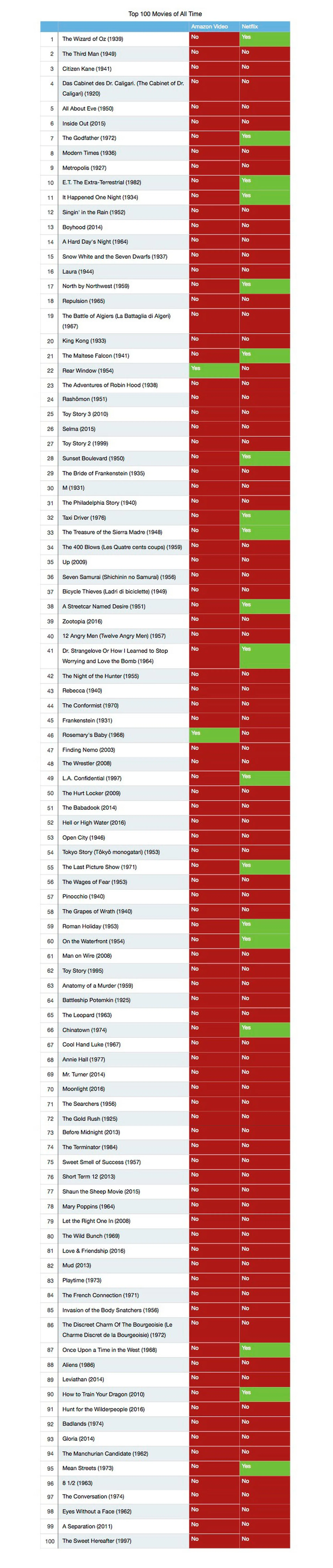 What if you’re a film buff who wants to watch the greatest 100 movies of all time? Here, Amazon Prime Video scores 2/100, while Netflix scores 19/100.