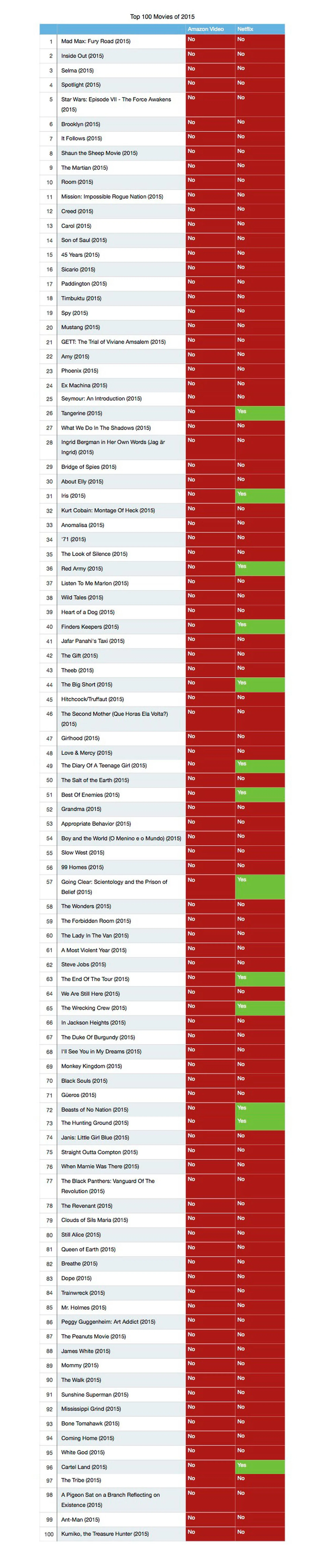 This list is fairer than the previous one, but the scores don’t improve much. If you want to catch up on the best movies of 2015, you’re out of luck on either service. Amazon Prime Video scores 0/100 and Netflix scores 13/100.