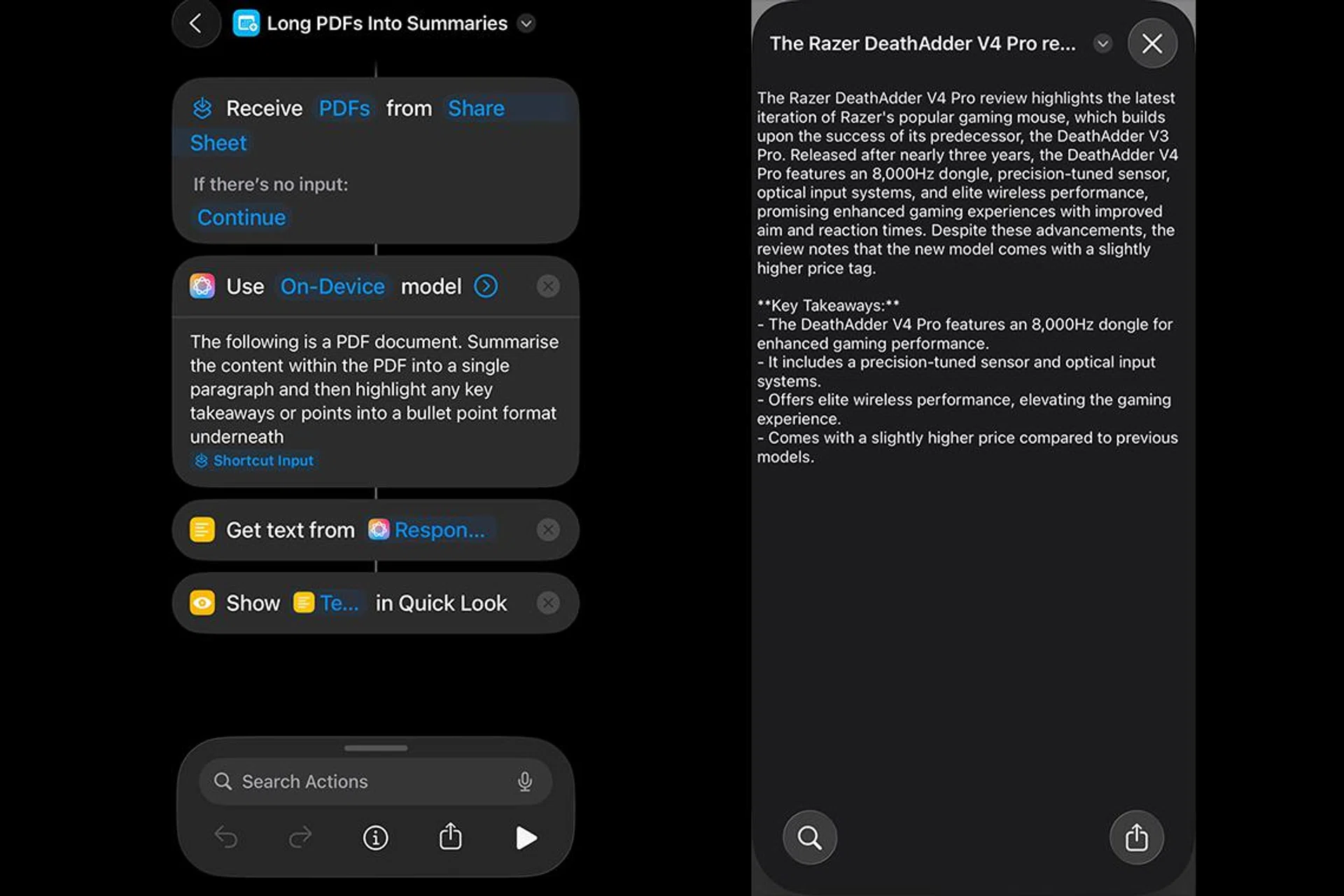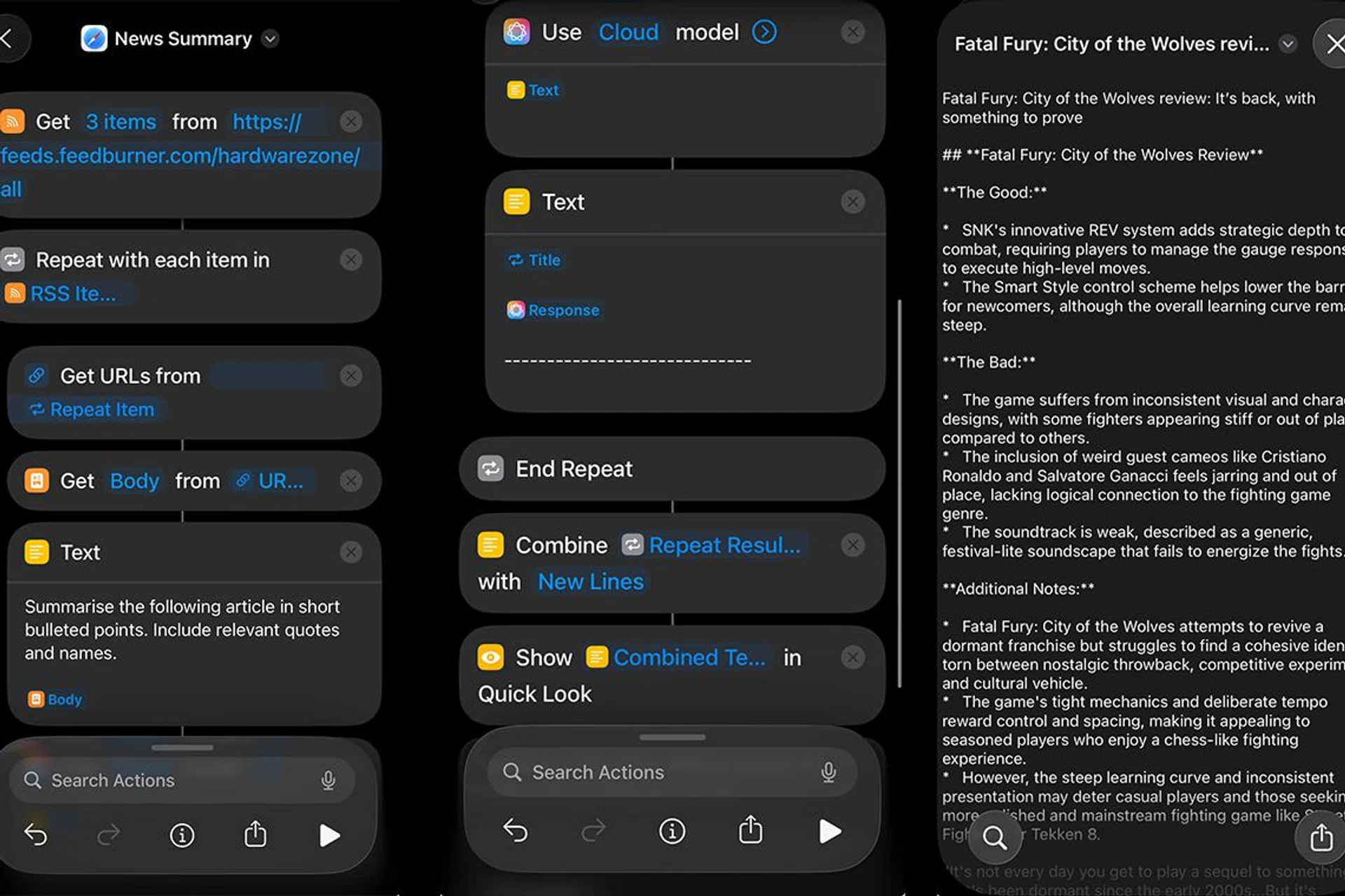 - Finally, add the “Quick Look” action to display all the summarised articles on a single, easy-to-read page.