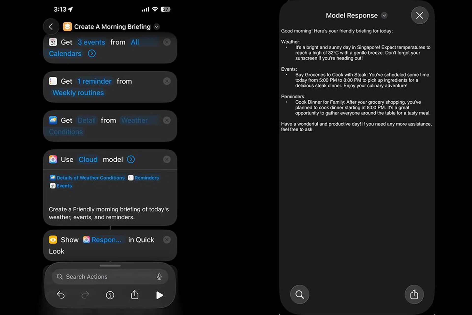 - Add the “Use Model” action and insert the following prompt “Create a friendly morning briefing that summarises today’s weather, calendar events, and reminders.”