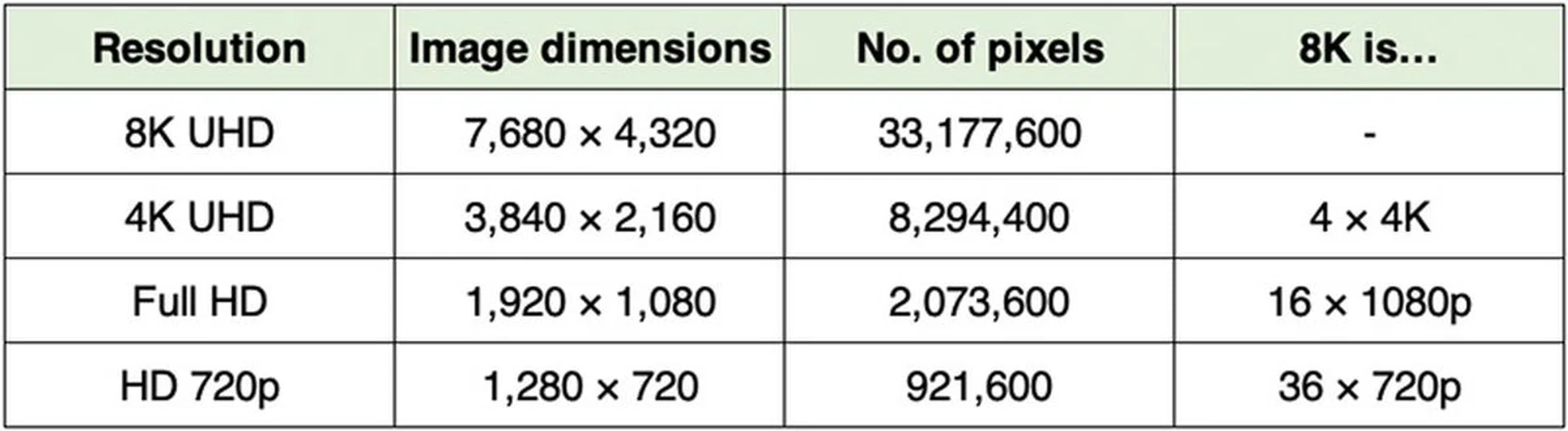 From just a resolution standpoint, 8K UHD simply has more pixels than 4K UHD. More specifically, 8K has 4 times the linear resolution of 4K, or 16 times the linear resolution of Full HD (1080p).