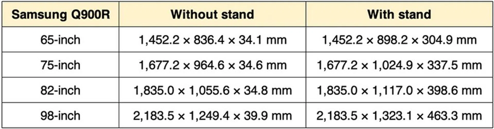 To give you an idea, here are the dimensions of the four 8K QLED TVs that Samsung are selling in Singapore: