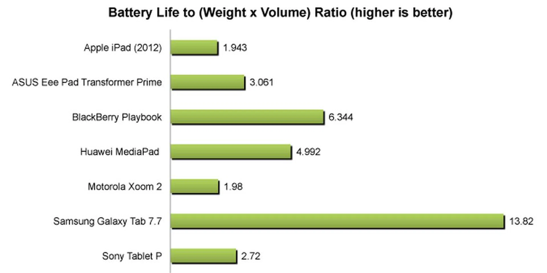 The numbers obtained from our battery tests can be translated to the portability of the tablet. This is achieved by calculating the ratio of the battery life to the (weight x volume) of the tablet. In this situation, a higher number translates to a better portability index, given that a higher battery life with a lower (weight x volume) index gives a higher ratio.