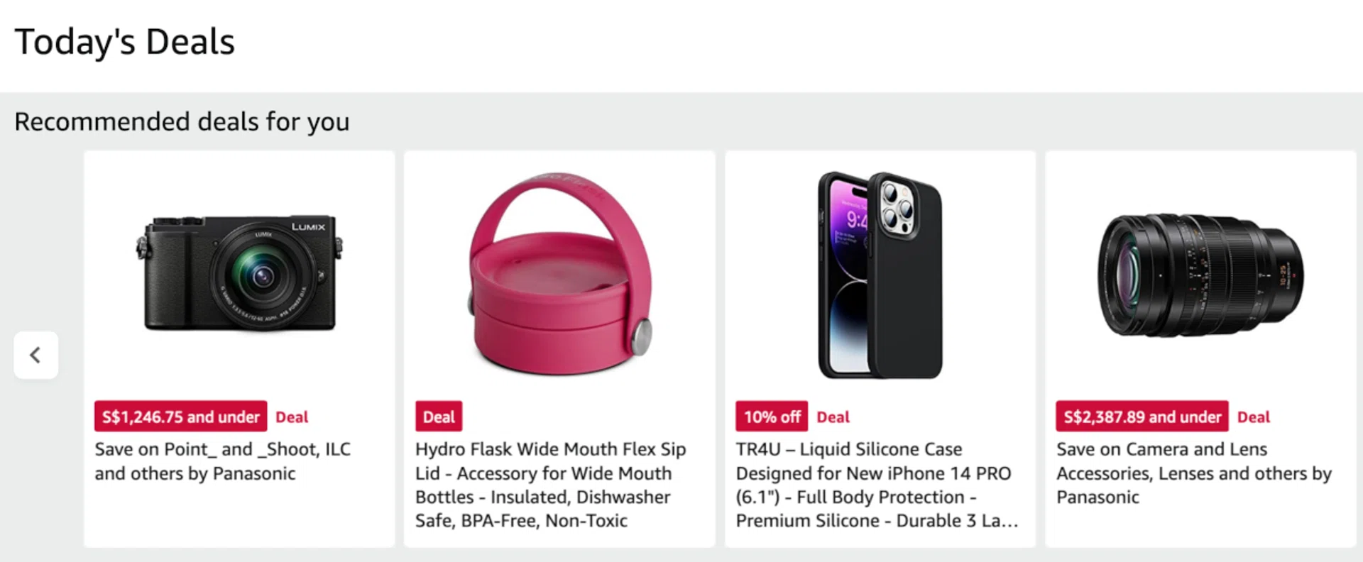 If you're not sure where to start, Amazon has you covered with Today's Deals. Amazon tailors your shopping experience by displaying a curated list of items as "Recommended deals for you". This is visible when you browse the Amazon deals category. This section also aggregates the best deals in the top user categories, so you can just select a category of choice and be presented with hundreds of deals to choose from.