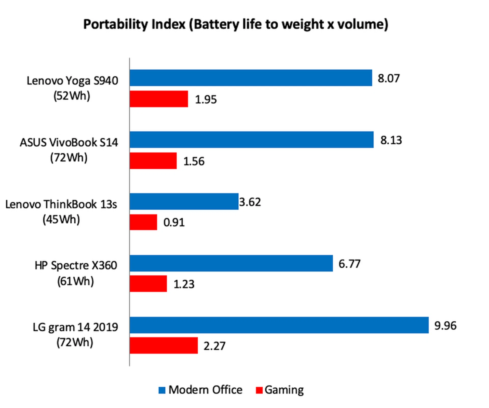 Looking at its Portability Index score, we can see that it almost rivals that of the ASUS Vivobook S14 and LG gram 14, two notebooks with huge batteries and designed specifically with long battery lives in mind.