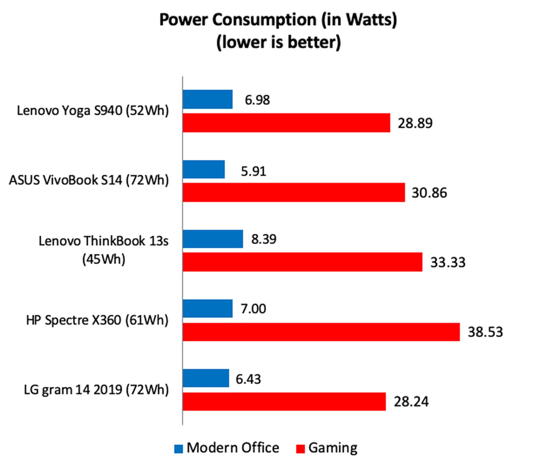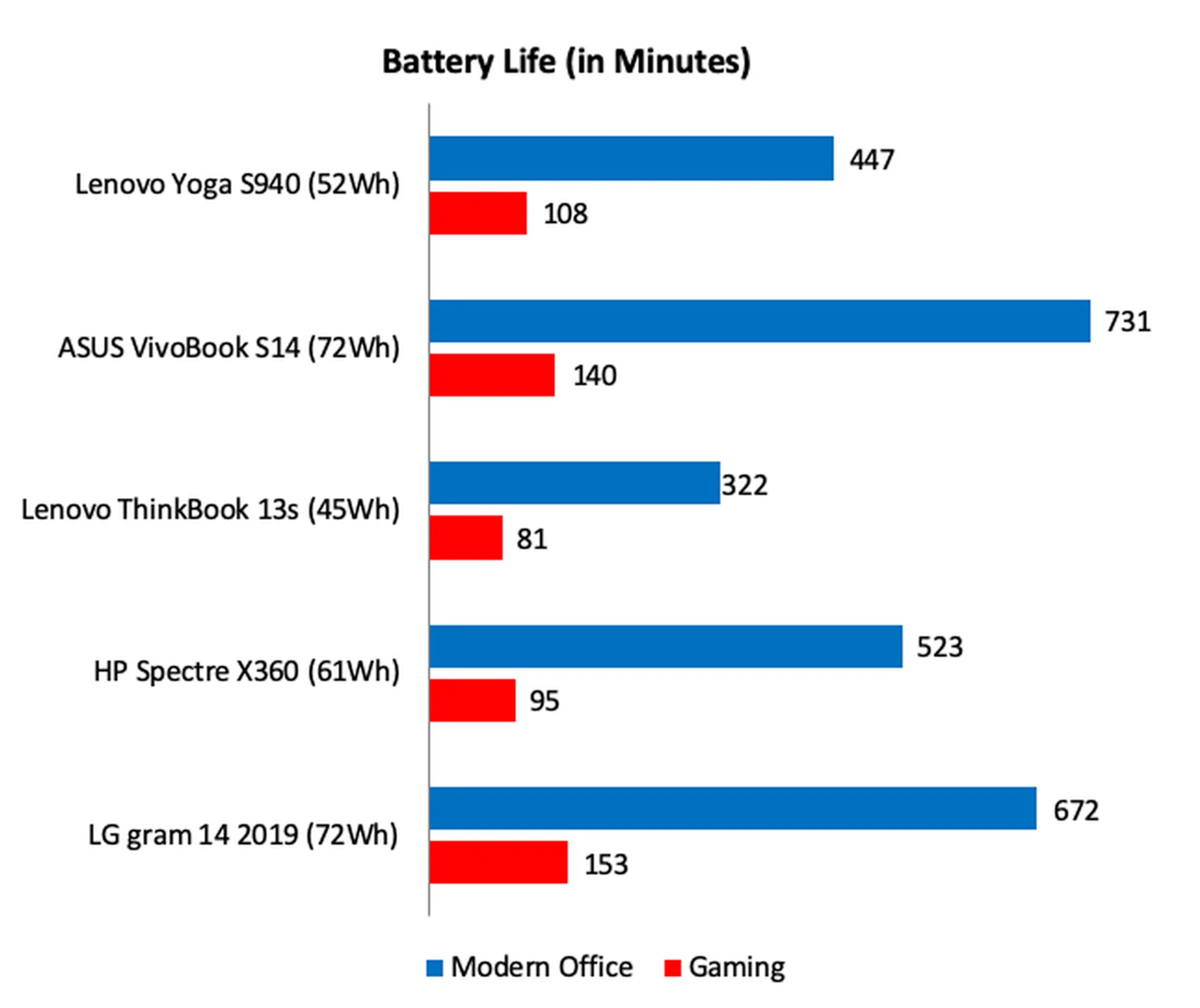 With that in mind, a 7 hour and 27 minute showing on the Modern Office workload is actually quite remarkable. I have no doubt that the Yoga C940 will comfortably exceed Intel’s target if we lowered the brightness by a couple of notches (the maximum brightness of the Yoga C940 is rated at 400 nits) to bring it more in line with the 250 nits brightness level that Intel uses for its own battery testing.
