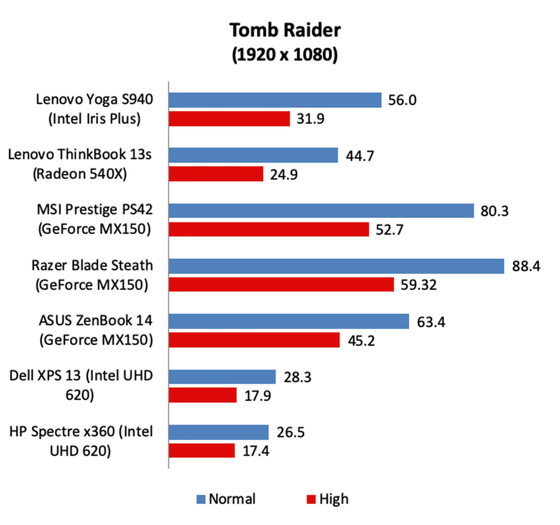 Intel made bold claims about the integrated graphics processor in its Ice Lake processors and the Yoga C940’s performance here was certainly encouraging. Thanks to its Iris Plus Graphics integrated GPU, the Yoga C940 was nearly twice as fast as the notebooks that were relying on the Intel UHD Graphics 620 integrated GPU in Tomb Raider. It even outperformed the Lenovo ThinkBook 13s which uses a discrete GPU in the form of AMD’s Radeon 540X. That said, NVIDIA’s GeForce MX150 still had the upper hand.