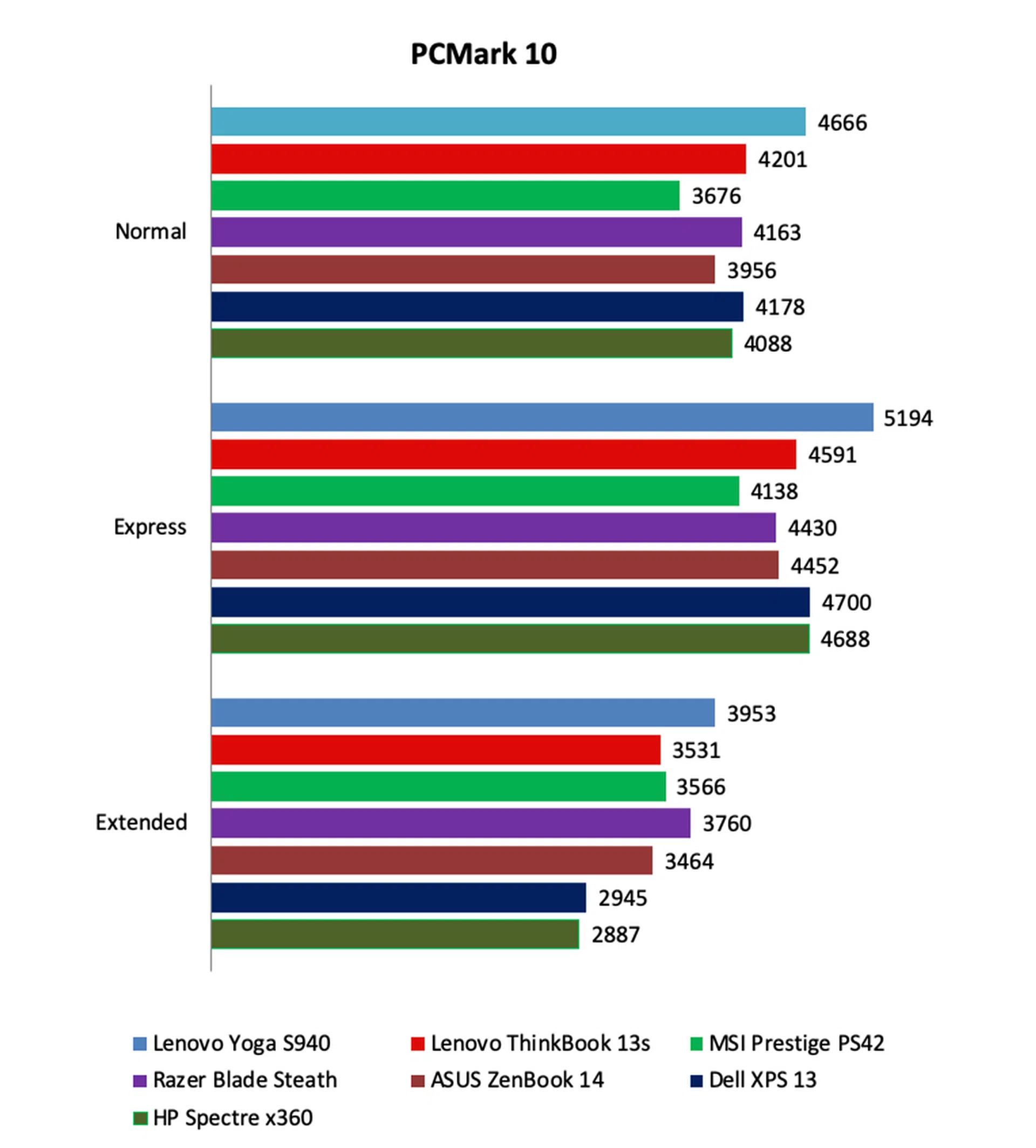 Performance in general productivity workloads was excellent as evidenced by the Yoga C940’s PCMark 10 results. It recorded higher scores than any other thin and light notebook that’s powered by Intel’s older 8th generation Whiskey Lake Core processor.