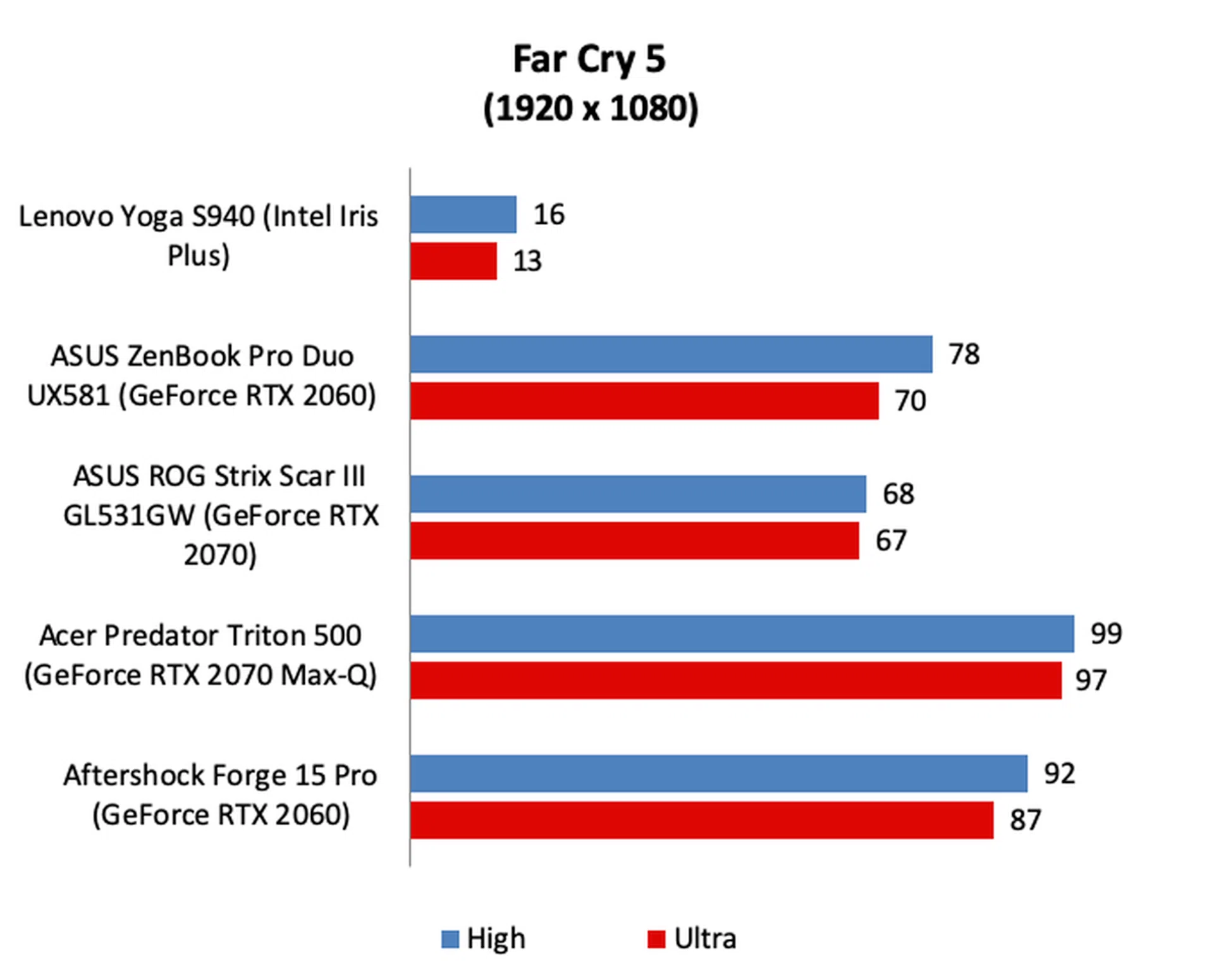 But don’t think for one moment that the new G7 Iris Plus graphics will let you play games. Switching over to a modern game (Far Cry 5) showed that there is still a long way to go before Intel’s integrated graphics solutions are truly game-ready. You'll need a beefy discrete GPU if you want to play the newest games at a reasonable resolution with normal graphics settings.
