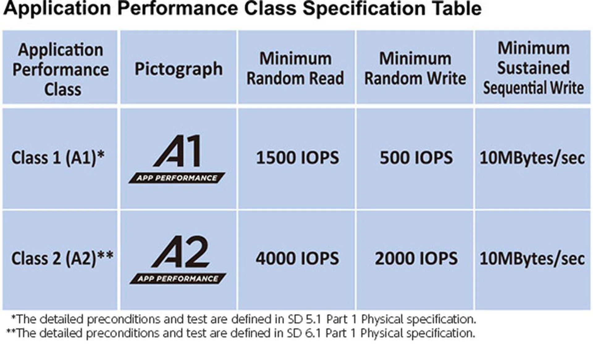 This is a new standard created by SD Association in 2016, denoted by a stylized "A" next to a number. This performance class refers to the card's minimum random read and random write speeds (measured in input/output operations per second - IOPS).